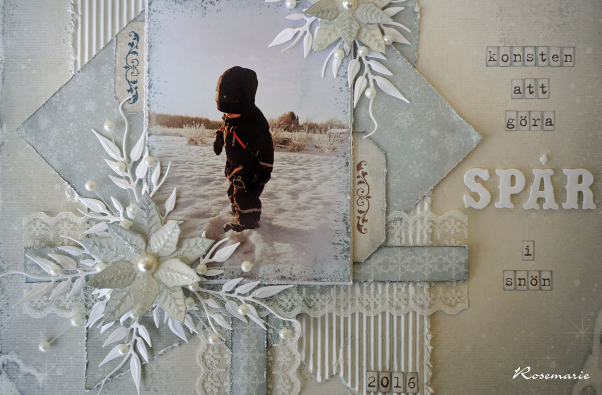 Temat på denna månads utmaning hos Pion Design är "vinterns magi" och det inspirerade mig till att skapa en LO med ett foto på Leo när han gör spår i snön genom att dra en fot efter sig. Han är så fascinerad av att det blir spår i snön nämligen. :-)